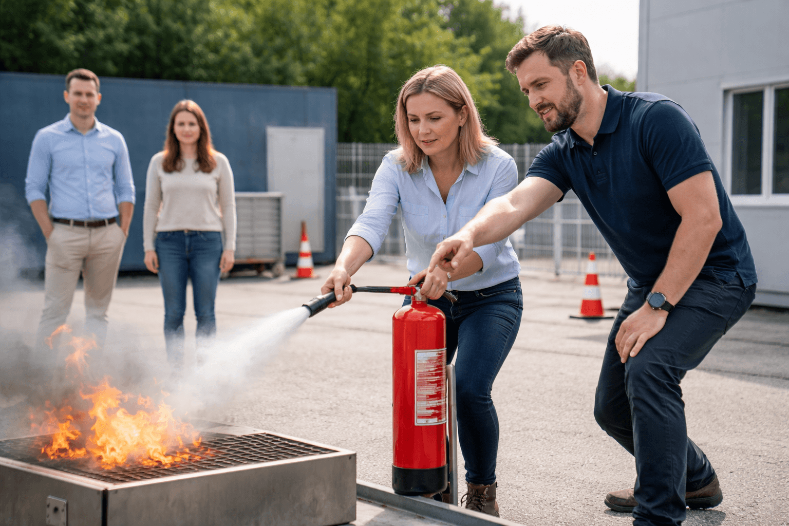 Die Schulung vermittelt die wichtigsten Grundlagen für den betrieblichen Brandschutz: Brandklassen, Löschmittel, Alarmierung, Evakuierung und sicheres Verhalten im Brandfall.